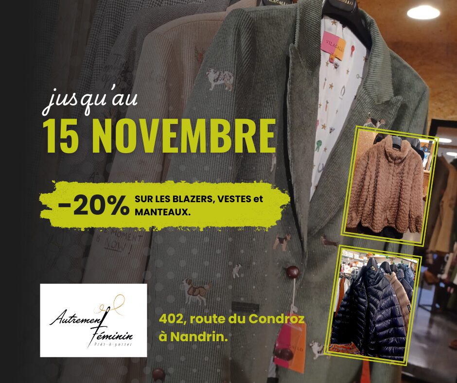 Jusqu’au 15 novembre, profitez de -20% sur une sélection de vestes, manteaux et blazers chez Autrement Féminin à Nandrin.L’occasion parfaite pour renouveler votre garde-robe avec style Autrement Féminin, 402 Route du Condroz à Nandrin.Venez découvrir nos pièces tendance et profitez de cette offre limitée ! Partagez la bonne nouvelle ! #AutrementFéminin #Promo #BonPlanMode #Veste #Manteau #Blazer […]